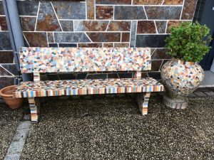 Et voilà une petite bruine qui chantonne sur le pare-brise pour nous dire que le repas est proche, oui mais il faut arriver au Faou, en dépit de travaux importants sur la voie rapide, où une table accueillante nous attend au restaurant “Le Relais de la Place” devant lequel un magnifique banc et une potiche – oeuvres d’un(e) mosaïste doué(e) invitent à l’admiration –