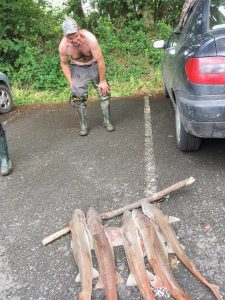 Et hop ! nous revoilà dans nos minibus respectifs, en route vers l’abbaye de St Gwenolé datant du Vème siècle, mais victime d’invasions normandes et d’expulsions lors de la Révolution, elle n’a été reconstruite qu’en 1950, grâce aux dons généreux des fidèles de ce saint. Cet endroit richement arboré de nombreuses essences et le monastère lui-même, sont porteurs de sérénité et appellent de nombreux visiteurs, et de plus, nous y avons rencontré deux pêcheurs – nous sommes en pleine verdure, mais la mer n’est jamais loin en Bretagne – l’un d’eux, aux bras richement tatoués, porte sur une épaule une brochette de poissons à l’aspect bizarre. Notre curiosité éveillée, les Bretons toujours communicatifs, enthousiastes et fiers, nous ont présenté le fruit de leur pêche et devinez ! : c’étaient cinq petits requins, dotés d’un aileron, oui ! inoffensifs par leur taille adulte d’un mètre vingt – soyez rassurés, vous pourrez vous baigner et nager sans risque d’être leur proie, on n’est pas en Australie, on est en Bretagne : d’ailleurs, ils se nourrissent de crabes, les gourmets ! et s’il vous arrive de les déguster, peut-être leur trouverez-vous un goût de lotte vanté par les pêcheurs qui voulaient nous les vendre, mais on n’allait tout de même pas les rapporter à notre Yannick – l’excellent cuisinier des Hespérides – c’était pas le but de la promenade ! Ben, voilà une découverte ! Quand on vous dit qu’il faut sortir …