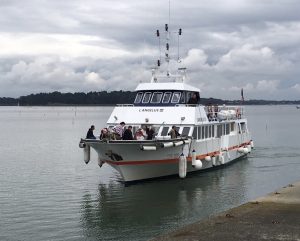 Si, de nos appartements et maisons, nous avons l’habitude d’interroger l’horizon, ici, en promenade en bateau dans le Golfe du Morbihan, nous avons à la fois, vue sur l’infini et sur les multitudes de propriétés qui recèlent leurs lots de trésors : chapelles, moulin à vent, calvaires, conifères et autres essences d’arbres, rochers, escarpements avec escaliers descendant à la mer, plagettes et bateaux et … toutes ces petites maisons blanches à pignons et toits d’ardoises qui éclatent de soleil et de lumière bretons.