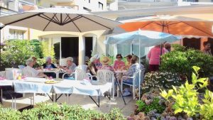 Seize résidents des Hespérides ont pris place dans deux minibus conduits par Martine et Jean-Guénaël : les voici installés ce mercredi matin du 19 septembre, sous un ciel plutôt généreux, malgré la menace de pluies éparses, d’une météo pessimiste et … souvent hésitante sur notre Ouest changeant, en direction de Pont-Aven.