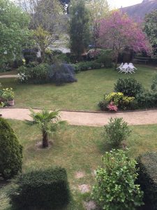 Extraordinaire de beauté luxuriante : admirez avec nous ses arbustes de toutes sortes, son fier chamerops parmi les conifères, les bambous, les hortensias, les croscomias, les lauriers-roses et j’en passe … bien sûr le marronnier, le cerisier du Japon et bien d’autres espèces à floraison printanière, sur un gazon qui a gardé sa verdeur malgré les rayons trop généreux de sa Majesté le Soleil, sous notre ciel breton de ce mois d’août particulièrement torride.